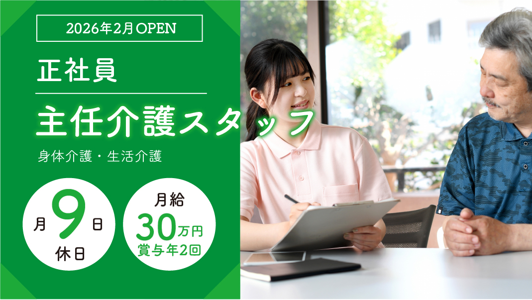 | 求人の詳細・ポイント | 新しい施設で、利用者様の笑顔を創る主任介護スタッフ2026年2月に開所する「カメリアハウス初芝」で、主任介護スタッフとして利用者様の快適な生活を支えませんか?私たちは、利用者様一人ひとりの尊厳を大切にし、きめ細やかなケアを提供することを目指しています。主任として、身体介護や生活援助はもちろんのこと、他の介護スタッフの指導・サポートを通じて、チーム全体の質を高める重要な役割を担っていただきます。オープニングスタッフとして、施設運営の初期段階から携わり、利用者様が安心して過ごせる「第二の家」を一緒に作り上げていく、大きなやりがいを感じられるでしょう。 施設内完結型!移動負担なしでケアに集中できる環境「外での移動や運転が多いと、利用者様との時間が十分に取れない…」そんな悩みを抱える方もいるかもしれません。カメリアハウス初芝では、施設内での介護業務が中心となるため、移動の負担がほとんどありません。満床時53室の利用者様に、じっくりと向き合い、それぞれのニーズに合わせた質の高いケアを提供することが可能です。業務に集中できる環境が整っているため、これまでの介護経験を存分に活かしたい方、利用者様とのコミュニケーションを深めたい方に最適な職場です。主任として、チームをまとめながら、利用者様との温かい絆を育んでいきましょう。 高月給30万円~!充実の福利厚生で長く働けるカメリアハウス初芝では、主任介護スタッフの方に月給30万円~と高水準の給与をご用意しています。一律夜勤手当(5回分)と固定残業代(25時間分)を含み、超過分は別途支給しますので、頑張りがしっかり収入に反映されます。昇給・賞与もあり、日々の努力が評価される環境です。さらに、社会保険完備、交通費実費支給、食事手当、制服貸与はもちろんのこと、年間休日111日、月9日休み、有給休暇、産休・育休制度も完備しており、プライベートやライフイベントも大切にしながら長く働ける体制が整っています。安心してキャリアを築ける職場で、あなたの力を発揮してください。 ご紹介先データ施設名カメリアハウス初芝 住所大阪府堺市東区引野町3-57-3 最寄駅南海高野線「初芝駅」徒歩6分